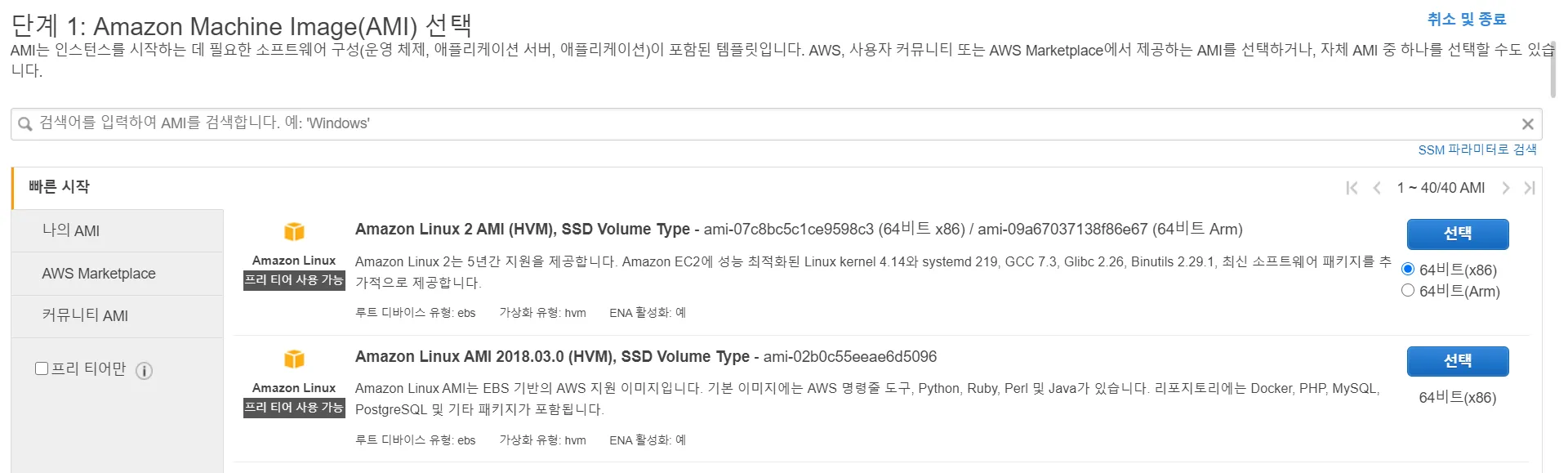 - 자신에게 필요한 Amazon Machine Image(AMI) 선택