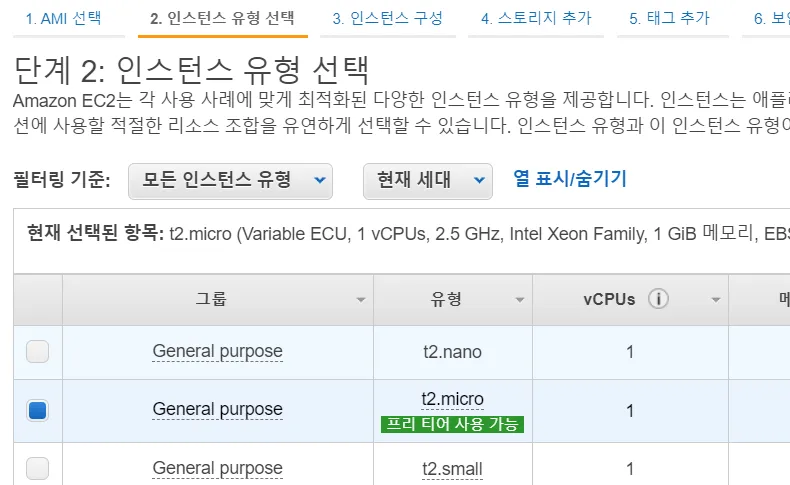 - 인스턴스 유형 선택