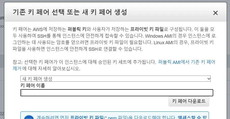 - 단계를 거치다 보면 키 페어 선택 또는 생성 화면이 나온다.