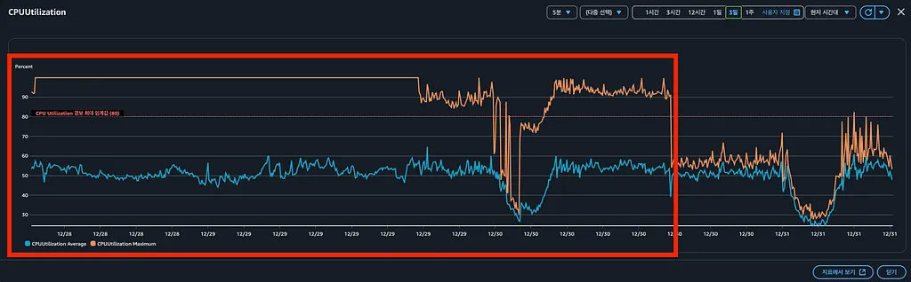 - 이후 CPU max 지표가 정상적으로 돌아왔습니다.