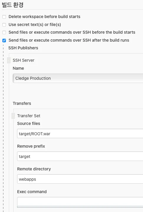빌드 환경 Send files or execute commands over SSH after the build runs 체크