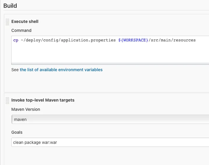 빌드는 Jenkins를 이용해 빌드를 할 예정이고 Spring Boot + maven 빌드를 이용해 war파일을 생성할 예정이다.또한 properties 파일은 빌드서버 디렉토리에 따로 보관하여 Jenkins 빌드 Excute Shell을 이용하여 파일을 복사해줄 것이다.
