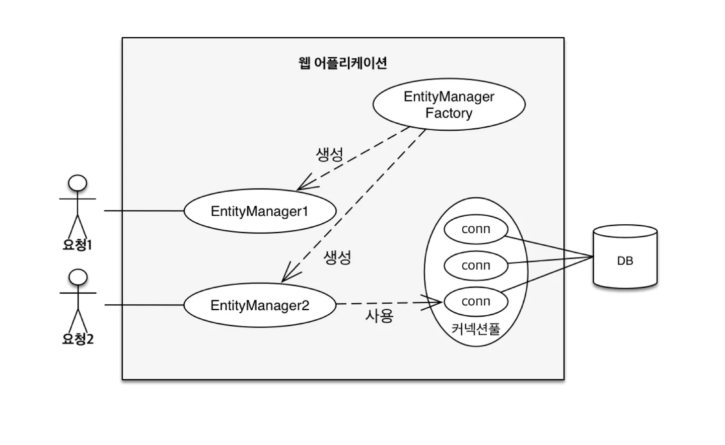 엔티티 매니저는 여러 스레드가 동시에 접근하면 동시성 문제가 발생한다. 스레드간에 절대 공유되면 안된다.