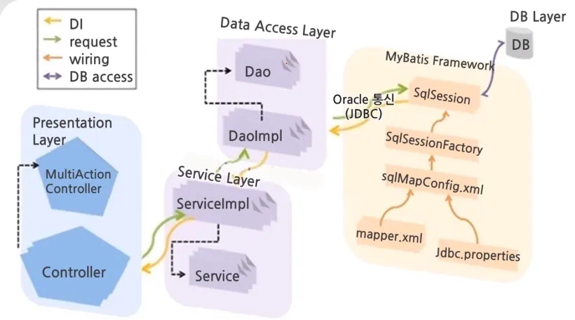 Mybatis는 Data Access Layer에서 사용하는 프레임워크이다. Controller에서 Service를 호출하고 Service가 DAO계층에 있는 메소드를 호출하면 DAO에서 Mybatis를 호출한다.
