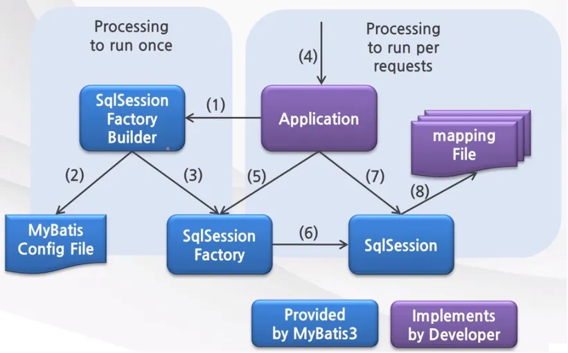 Application에서 SqlSession Factory Builder를 호출하고 SqlSession Factory Builder가 Config File을 읽고 Factory를 생성해준다. 개발자가 DB에 insert하거나 Read하는 메서드를 호출하면 SqlSession Factory가 SqlSession를 생성하고 개발자가 작성한 Application코드에 반환해준다.