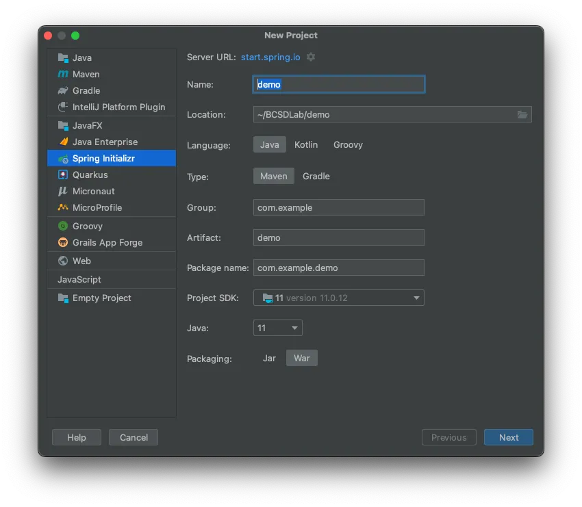 IntelliJ에서 기본으로 제공해주는 Spring Initializr를 사용했지만 https://start.spring.io 에서 만들어도 된다.]